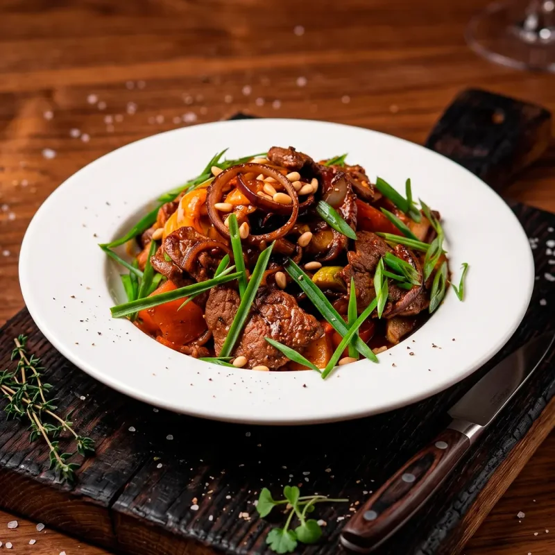 Тёплый острый салат с овощами и нежной телятиной Обжаренные овощи с телятиной и пикантной остротой 3190 ₸