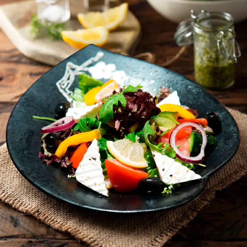 Хоретика (греческий салат) Свежие томаты и огурцы, фетакса, маслины, красный лук и оливковое масло 2390 ₸