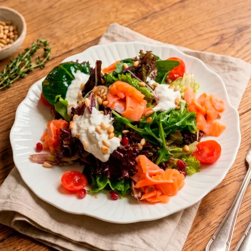 Салат с копчёной форелью Сочетание копчёной форели и нежной страчателлы со свежими овощами и лёгкой заправкой 3190 ₸