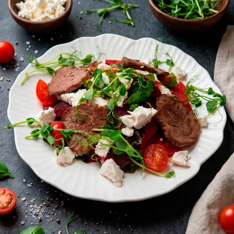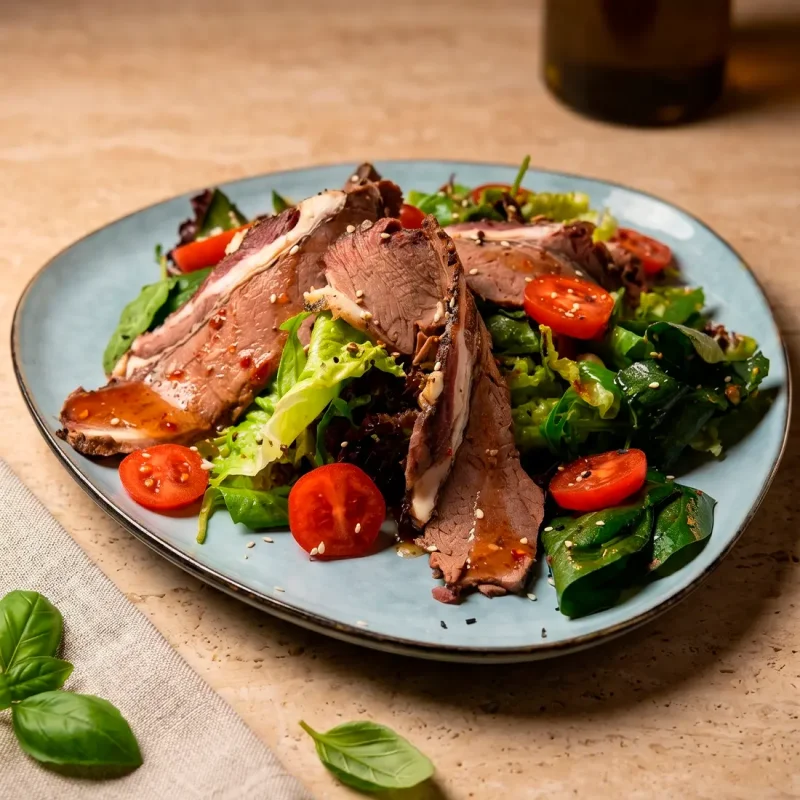 Салат с ростбифом в кисло-сладкой заправке Ростбиф с деликатным вкусом, свежими овощами и лёгкой кисло-сладкой ноткой соуса 3190 ₸