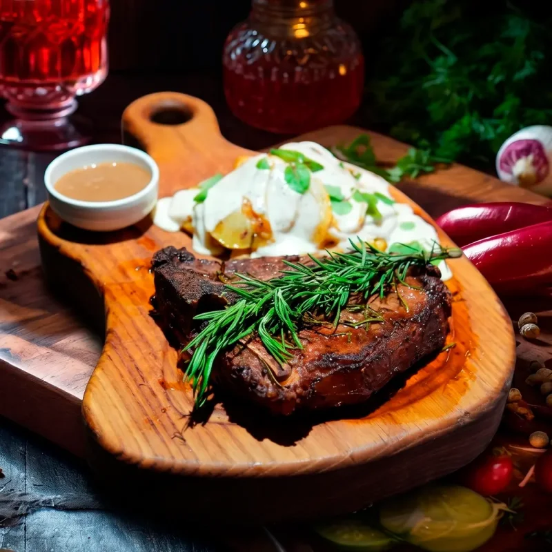 Тибон с пряными картофельными дольками Сочный Тибон с выразительным мясным вкусом, приготовленный до идеальной прожарки. Подаётся с ароматными картофельными дольками 6990 ₸