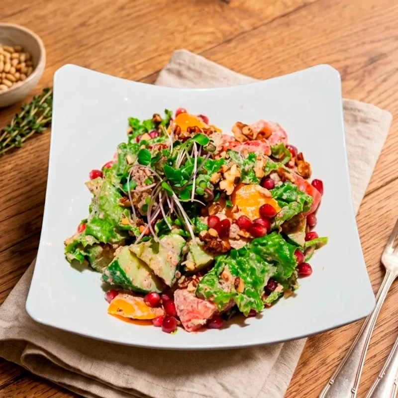 Свежий салат в ореховой пасте Хрустящие фермерские огурцы и спелые томаты, сочный лук и густая ореховая паста 2690 ₸