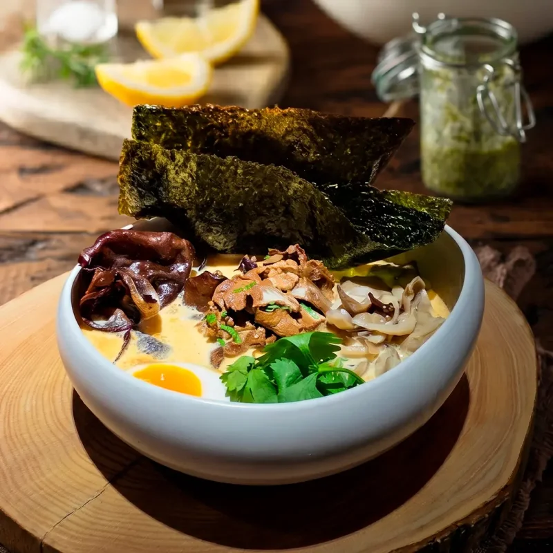 Сырный рамен с говядиной и грибами Насыщенный рамен с нежной говядиной, грибами и сливочно-сырным бульоном 3390 ₸