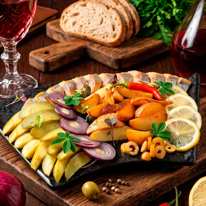 Закуска к водочке с копчёной сельдью Классика с настроением: дымная сельдь, картофель, соленья и лук. Контраст вкусов, который идеально собирает стол 3490 ₸